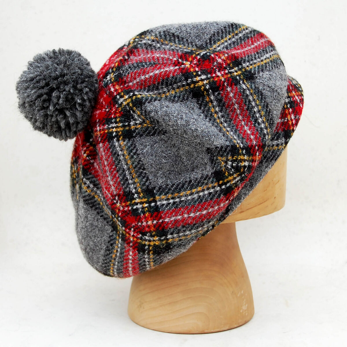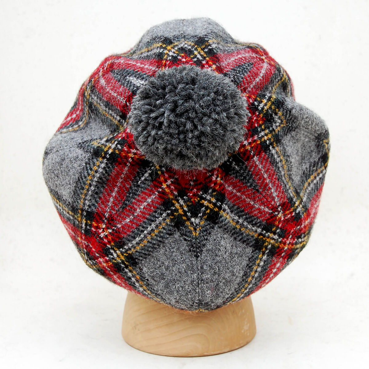 Handmade Scottish Oversized Tam in grey and red tartan Harris Tweed with optional Pom-Pom